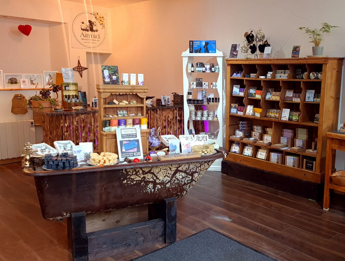 Gift shop: Airmid natural Irish soap and skincare, aromatherapy candles and melts, Irish art, woodwork, ceramic dishes, wool socks, cards, mugs, notebooks, fairies, eco toys, sustainable bathroom accessories.