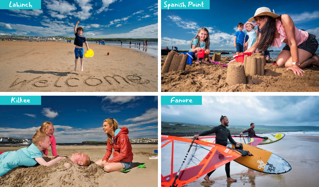 Clare has nine Blue Flag beaches. Each has a unique charm and offers varied activities and experiences at different times of the year. The two coastal Blue Flag beaches in North Clare are at Lahinch seaside resort and Fanore. Both are golden-sand beaches, and excellent for surfing and water activities. The coastal Blue Flag beaches in West Clare are at Kilkee, Spanish Point, White Strand Doonbeg, White Strand Miltown Malbay, and Cappa Pier, Kilrush. Kilkee and Spanish Point are golden-sand seaside resorts.