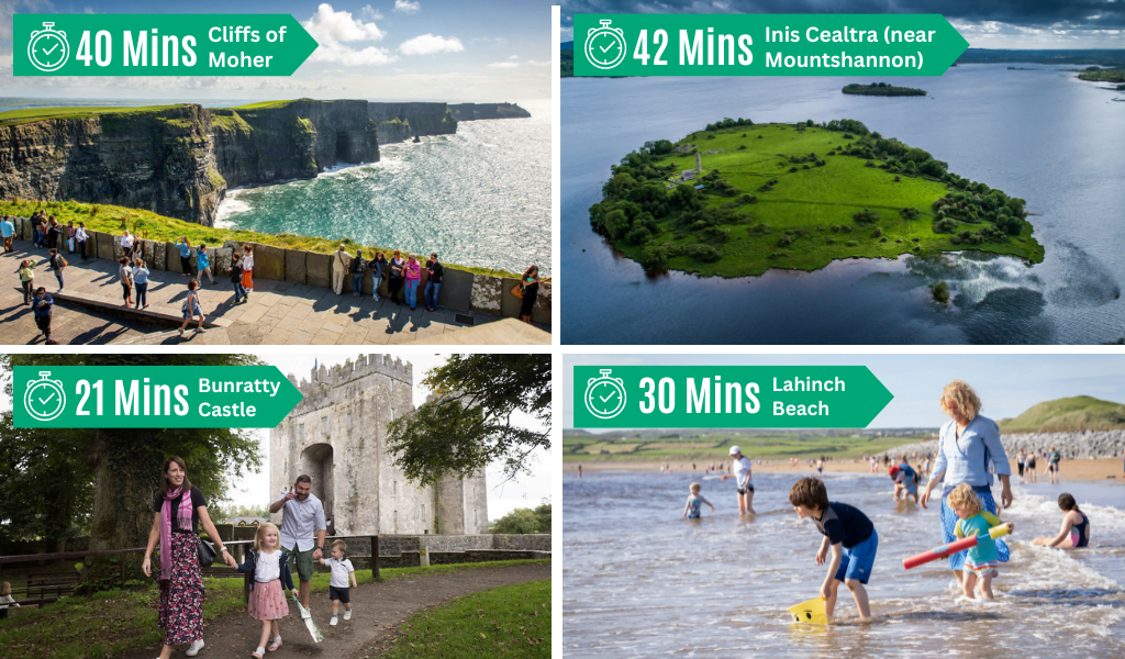 Ennis, the county capital, and Ireland’s friendliest place is located at the the centre of Clare. It means it is an ideal base to stay and for touring Clare. Driving from Ennis, you can be on the Atlantic Coast within 30 minutes, Bunratty Castle and Folk Park with 21 minutes, and Mountshannon, Lough Derg within 42 minutes.