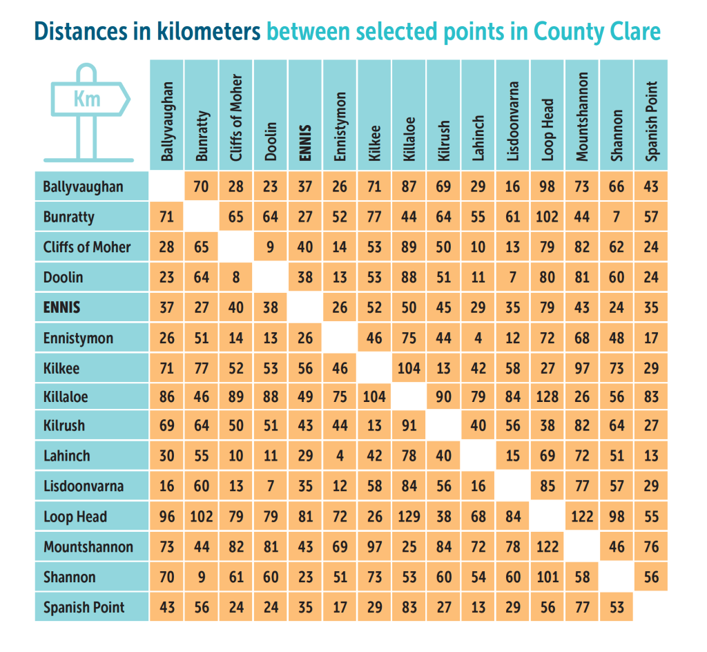 This distance matrix can help you plan your itinerary during you time in Clare. Distances are approximate and are based on the most direct routes, by car.