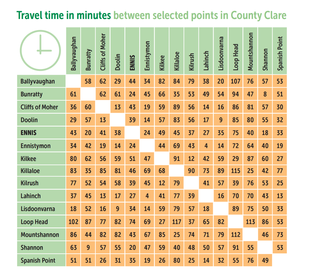 This travel time matrix can also help you plan your days in Clare. Times are approximate (in minutes) by car and are are based on the most direct routes. It’s important to note that times are for planning purposes only. They will also vary based on weather, traffic conditions, road works etc.