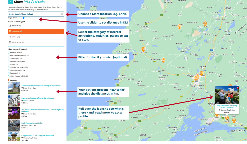 Our ‘show near to’ google map is really handy. Pick any place in Clare and you can see what’s near to it. You can also use the distance ‘slider’ to set any distance parameter (the default is 50km) and then filter by attractions, activities, places to eat, or places to stay. For example, places to eat within 10km of Ennis (the county capital); or places to golf within 60 km of wherever you are staying in Clare. You can view the ‘Show Near to” map here.
